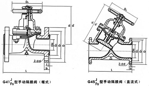 三、G41F46衬氟隔膜阀外形连接尺寸及重量:
