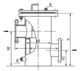 SRBB 高低平底篮式过滤器主要由挡管、筒体、滤篮、法兰、法兰盖及紧固件组成。当流体通过筒体进入滤篮后,固体杂质颗粒被阻挡在滤篮内,而洁净的流体通过滤篮过滤由过滤器出口排出。当需要清洗时,旋开筒体底部螺塞排除流体,拆卸法兰盖,取出滤篮,清洗后重新放入即可。