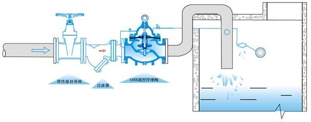 当管道从进水端给水时,由于针阀、球阀、浮球阀是常开的,水通过微型过滤器、针阀、控制室、球阀、浮球阀进入水池,此时控制室不形成压力,主阀开启,水塔(池)供水。