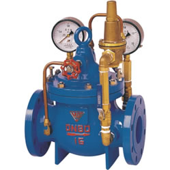200X减压稳压阀由主阀、导阀、针阀、球阀、微型过滤器和压力表组成水力控制接管系统。使用时,当调定出口压力后,能自动保持稳定出口压力。利用导阀自力控制,不需要其它装置和能源,保养简便,压力控制准确度高,受进口压力和流量影响小,减压稳压可靠。广泛用于高层建筑、生活区等供水管网系统及城市供水工程。